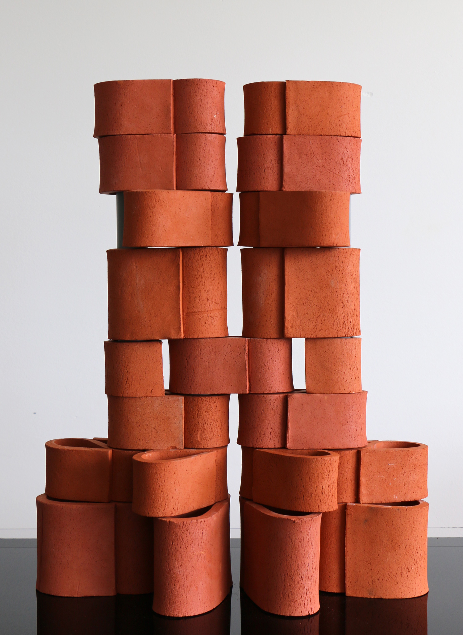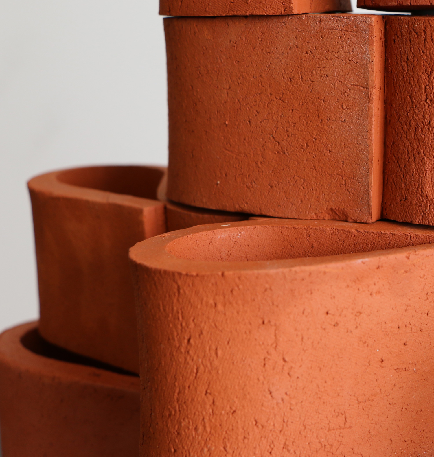 Can the sound of material shape space? A traditional architectural technique of terracotta is translated it into a modular sculptural structure of evaporative cooling. The terracotta was textured and fired in low temperatures to increase porosity. The brick shape allows them to be restacked and used inside or outside. The cycle of irigation and evaporation is audible.